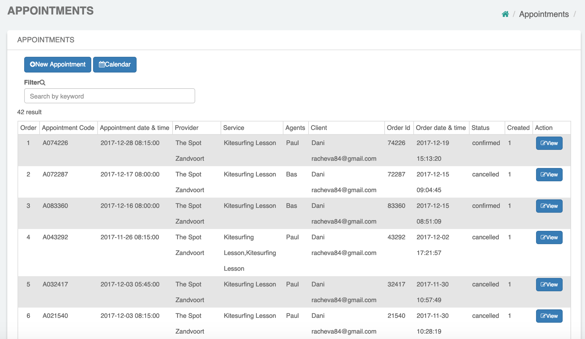 View your complete list of appointments. Agents can view their own appointments. Location managers can view appointments of their locations and the business owner (account admin) can view all appointments, i.e. the appointments of all locations and agents (resources).
