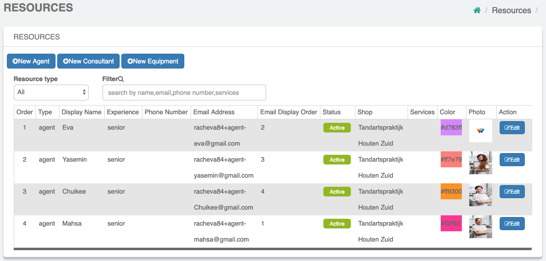 Manage your list of resources by adding and editing your agents, consultants and/or equipment and the related to them details, e.g. name, description, photo(s), contact etc. and assign each to one or more of your locations.